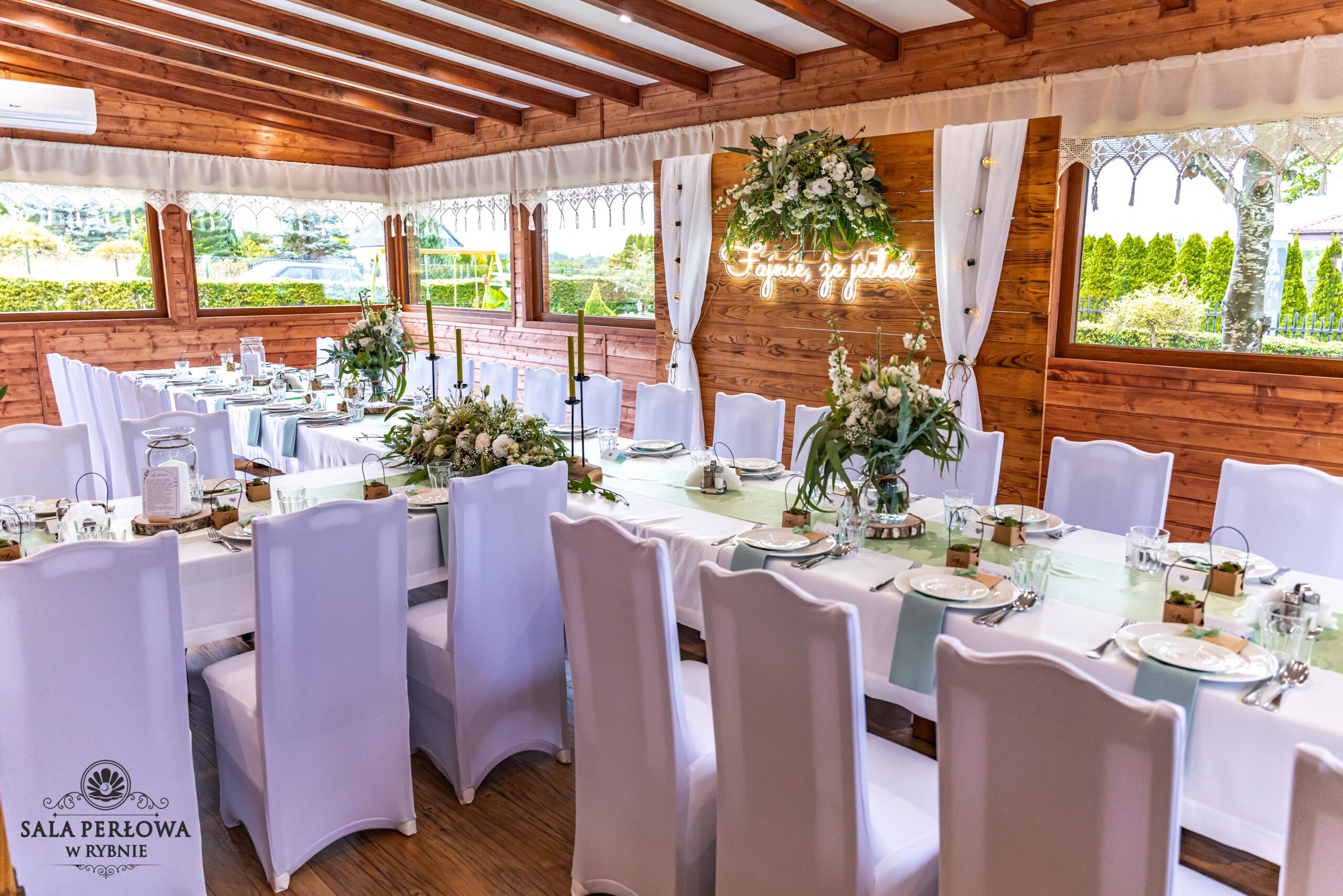 Sala weselna Perłowa to obiekt gastronomiczno-usługowy położony w Rybnie, niedaleko Gniewina i Wejherowa. Zorganizujesz tutaj liczne przyjęcia, począwszy od imprez okolicznościowych, poprzez chrzciny, komunie, aż po wesele. Na naszym terenie znajdują się dwie niezależne sale bankietowe – jedna mieszcząca 120 osób, a druga 60 osób oraz drewniana wiata biesiadna, która stanowi idealne miejsce na plenerowe uroczystości, grille oraz spotkania w kameralnym gronie. Otoczona zielenią tworzy przytulną atmosferę, sprzyjającą relaksowi czy wspólnej zabawie na świeżym powietrzu. Atrakcyjne położenie, elegancki wystrój oraz pyszne jedzenie przyciągają do naszego lokalu gości z okolicznych miejscowości. Zaufali nam już klienci z Pucka, Gdyni, Wejherowa, Rumi, Redy oraz wielu innych miejscowości z woj. pomorskiego. Dołącz do tego grona!